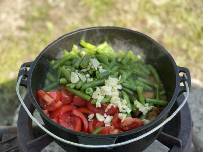 Peste carnea fragedă din ceaun, am adăugat restul ingredientelor: roșiile, fasolea verde și usturoiul.