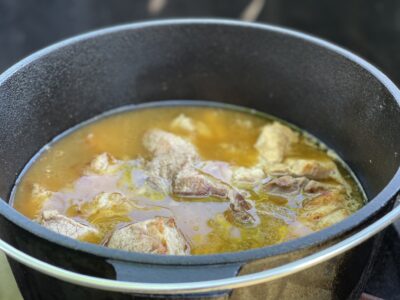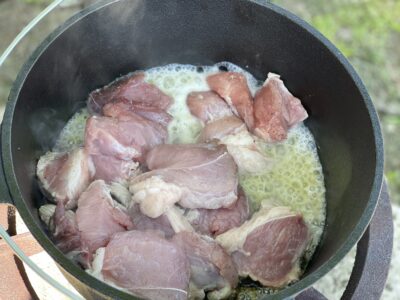 Vântul adie ușor, făcând flacăra de sub ceaun să apară și să dispară de la o secundă la alta. Între timp, carnea s-a rumenit frumos și e gata pentru următorul pas.