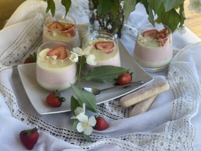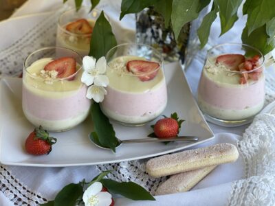 Mousse de Căpșuni și Ciocolată Albă – sună exact ca esența parfumată a acestei luni, pe care am vrut să o surprind într-un pahar. Un desert simplu, dar elegant, care adună în straturi gustul lunii mai: mousse de căpșuni parfumat, mousse catifelat de ciocolată albă și un decor dulce, cât o promisiune de vară – căpșuni proaspete feliate și firimituri fine de pișcot.