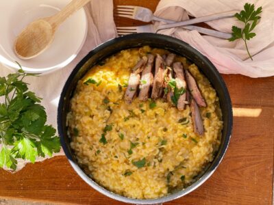 Am servit orezul cremos în boluri albe, pentru ca frumusețea culorii portocalii a dovleacului să iasă în evidență. Am așezat deasupra fâșiuțele de carne, am presărat extra parmezan și am adăugat câteva fire de pătrunjel, pentru prospețime și contrast de culoare.