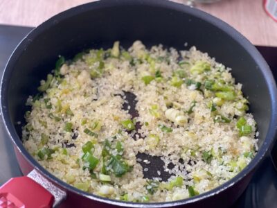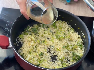 Ne întoarcem la tigaia cu legume, care s-au înmuiat deja ușor. Am adăugat orezul direct, fără să-l spal – la fel ca la risotto – și l-am amestecat bine, ca boabele să fie acoperite uniform de uleiul aromat. L-am gătit 2–3 minute la foc mic, amestecând constant, până s-a pătruns de aromele legumelor, apoi am adăugat vinul alb și l-am lăsat să se evapore complet. Eu am ales să-l folosesc și chiar îl recomand, pentru aroma subtilă pe care o oferă preparatului.