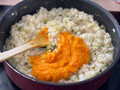 Când orezul a ajuns aproape gata, am adăugat piureul de dovleac și l-am amestecat ușor, astfel încât să obțin un orez uniform, cremos și cu o culoare caldă, portocalie.