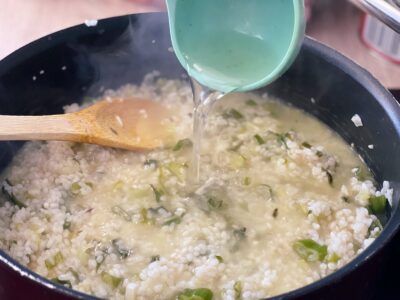 Am început să adaug supa fierbinte, câte un polonic odată, amestecând constant orezul. Lichidul se absoarbe treptat, exact ca la risotto, și ajută boabele să elibereze amidonul, creând o textură cremoasă. Am continuat astfel până când orezul a absorbit aproape toată supa și a devenit moale, dar boabele își păstrau forma.