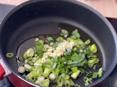Am început prin a pregăti legumele: cum dovleacul era deja copt și transformat în piure, nu mi-a rămas decât să toc ceapa și usturoiul. Le-am pus la călit în uleiul de măsline, pe foc mic, având grijă să nu se ardă.