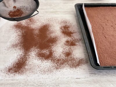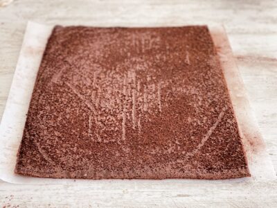 Pe o altă bucată de hârtie de copt am cernut un strat fin de cacao. Aceasta nu doar că adaugă aromă, dar previne și lipirea blatului de hârtie, oferindu-i în același timp un aspect plăcut, asemănător unei scoarțe de copac.
