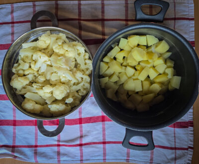 Între timp curăță cartofii, taie-i cuburi, iar conopida rupe-o buchețele de mărimi aproximativ egale.