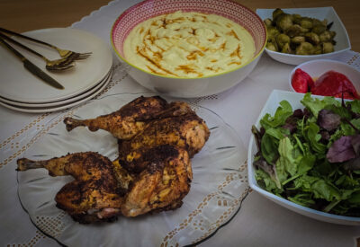 Puiul, deschis și aplatizat ca o aripă, se marinează în condimente aromate care pătrund adânc în carne peste noapte. A doua zi, când îl pui la cuptor, aroma lui umple bucătăria treptat, amestecându-se cu mirosul untului topit și al legumelor. Cartofii și conopida, spumate împreună, devin un piure fin și mătăsos, în care brânza cremoasă aduce acea notă subtilă de prospețime.