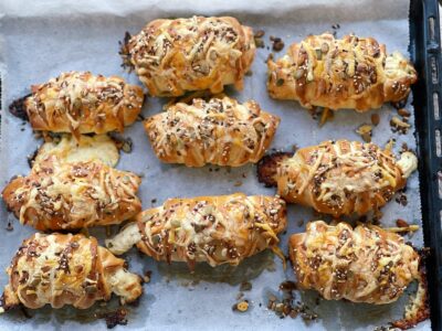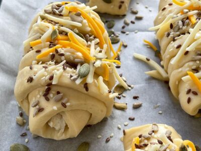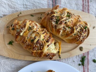 Cornuri pufoase cu pui și brânzeturi – alegerea mea yummy de astăzi. Să vă explic un pic de ce le-am ales: au brânzeturi (deci eu mare fan, știți deja), aluat pufos cu lapte și olecuță de pui (opțional, dar dă foarte bine la final), miros de unt (hello, pâine proaspăt coaptă cu unt – deja miroase a câștigător!) și ce mai era… ah, da, unde mai pui că sunt perfecte nu doar să impresionezi neamurile, ci și ca mic dejun, brunch sau chiar o gustare sățioasă cu prietenii, la o barfă mică shhht!