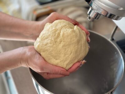 Am adăugat apoi restul ingredientelor necesare pentru aluat și am lăsat robotul să frământe 8–10 minute, până am obținut un aluat elastic, ușor lipicios și minunat de pufos. Lăsăm aluatul să dospească pentru 1–1,5 ore, până își dublează volumul.