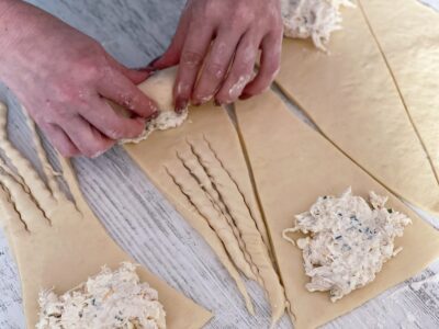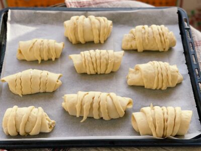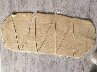 Întindem aluatul pe o suprafață ușor înfăinată, într-un dreptunghi de aproximativ 40×30 cm. Îl tăiem în 8–10 triunghiuri (nu vă temeți de capetele rămase – le puteți uni și forma alt triunghi).
