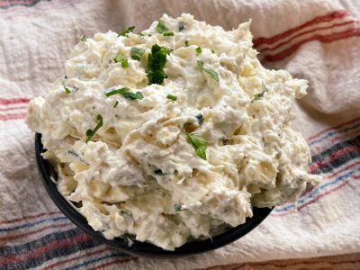 Mai întâi combinăm crema de brânză cu laptele sau smântâna – eu am ales smântâna – apoi adăugăm ierburile aromatice, sare și piper după gust. Atenție cu sarea, brânzeturile au deja sare în ele!