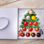 În perioada asta, ne jucăm mult cu ciocolata. Facem praline, temperăm ciocolata manual, pe blatul rece de marmură, și colorăm formele cu pensula, ca pe niște mici opere de artă. Pentru Crăciunul acesta am pregătit o cutie specială: un brad plin de lumină, încărcat cu globuri din ciocolată, pictate manual, cu grijă și bucurie.”