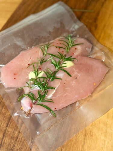 Am început cu pieptul de curcan, pe l-am asezonat cu sare, piper, fulgi de chili, usturoi și rozmarin, apoi l-am sigilat într-o pungă pentru gătit sous-vide, cu un strop de ulei de măsline.