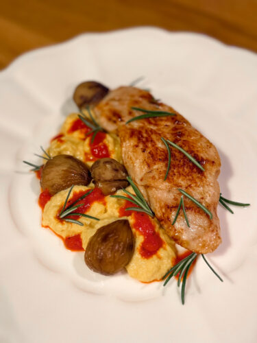 Pentru plating, am așezat în farfurie un strat de cremă de porumb caldă, deasupra o felie frumoasă de curcan, caramlizată din tigaie, lucioasă și fragedă. Peste piure, câteva linii de coulis roșu intens, ca un accent pictural, castane coapte și frunzulițe mici de rozmarin pentru prospețime.