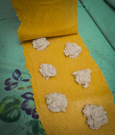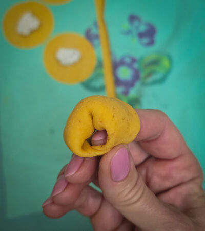 Decupează discuri din foile portocalii. Pune o jumătate de linguriță de umplutură în mijloc, împăturește în jumătate și apoi unește colțurile pentru a obține forma clasică de tortellini.
