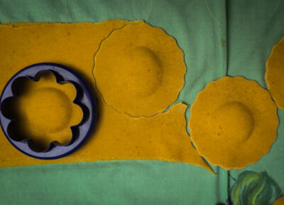 Întinde aluatul de dovleac în foi foarte subțiri (aprox. 1 mm), ideal cu mașina de paste până la nr.6. Procedează la fel și cu aluatul verde. Acoperă foile cu un prosop de bucătărie ca să nu se usuce.