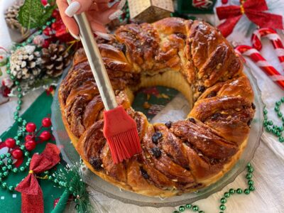 Rulăm aluatul strâns pe lungime, îl tăiem pe lung în două și răsucim cele două părți cu crema la vedere. Formăm apoi un cerc și lipim capetele, așezând coronița cu grijă într-o tavă tapetată cu hârtie de copt. Lăsăm să crească încă 20–30 de minute — aromele se combină, iar aluatul devine și mai pufos.