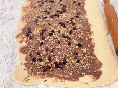 Când aluatul a crescut frumos, îl răsturnăm pe blatul ușor presărat cu făină și-l întindem într-un dreptunghi generos. Apoi vine partea cea mai gustoasă: întindem uniform crema de ciocolată peste aluat și presărăm nucile și merișoarele uscate.
