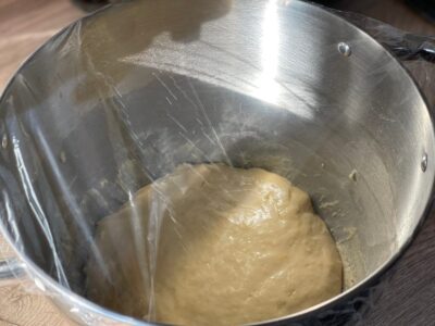 Începem cu aluatul: într-un bol mare amestecăm făina, zahărul, sarea și drojdia. Adăugăm apoi laptele călduț, ouăle și coaja rasă de portocale și începem să frământăm până obținem un aluat elastic. La final, încorporăm untul topit, iar după câteva minute bune de frământare aluatul devine pufos și moale. Îl acoperim cu un prosop curat și-l lăsăm să stea 1,5–2 ore, până își dublează volumul.