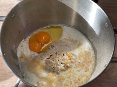 Cu câteva minute înainte de a scoate coronița babka din cuptor, pregătim și siropul. Fierbem zahărul cu apă și sucul de portocală câteva minute, apoi îl lăsăm la răcorit 2–3 minute.