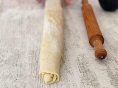 Atenție: când întindeți crema, lăsați o margine liberă pentru a putea sigila mai ușor aluatul după rulare.