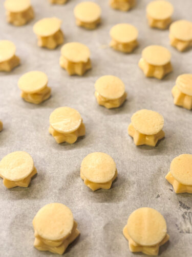 În timp ce aluatul se răcea, pentru craquelin am amestecat 80 g făină, 80 g unt și 70g zahăr, le-am întins între două foi de hărtie de copt, până la grosimea de 2mm, și am pus foaia la congelator în timp de am pregătit aluatul. Am tăiat discuri mici, cu diametrul de 2 cm și le-am lăsat la rece. Am poșat aluatul pentru cojile de choux și pe jumătate dintre ele am adăugat discurile de craquelin.