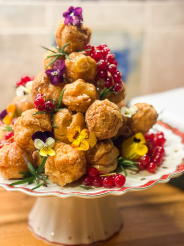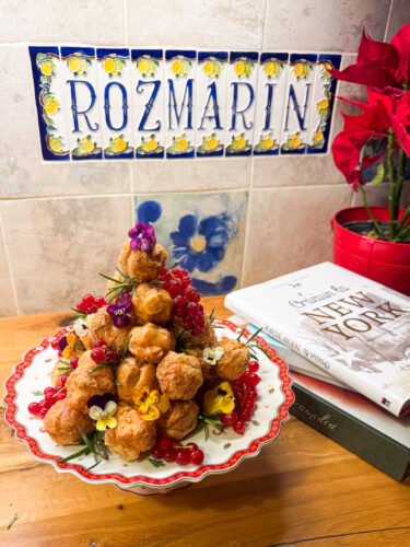 Croquembouche cere puțin timp, dar se pregătește relaxat, în avans, așa că ajută la o atmosferă destinsă în timpul prânzului. Iar micile detalii, cum sunt florile, coacăzele roșii si acele de rozmarin îi adaugă un farmec aparte. Am simțit nevoia de lejeritate, așa că micul meu turn de turnul de choux umplute cu cremă de vanilie a adus aerul francez al sărbătorilor – elegant, crocant, aerat, exact ce voiam pentru finalul unui prânz de familie.